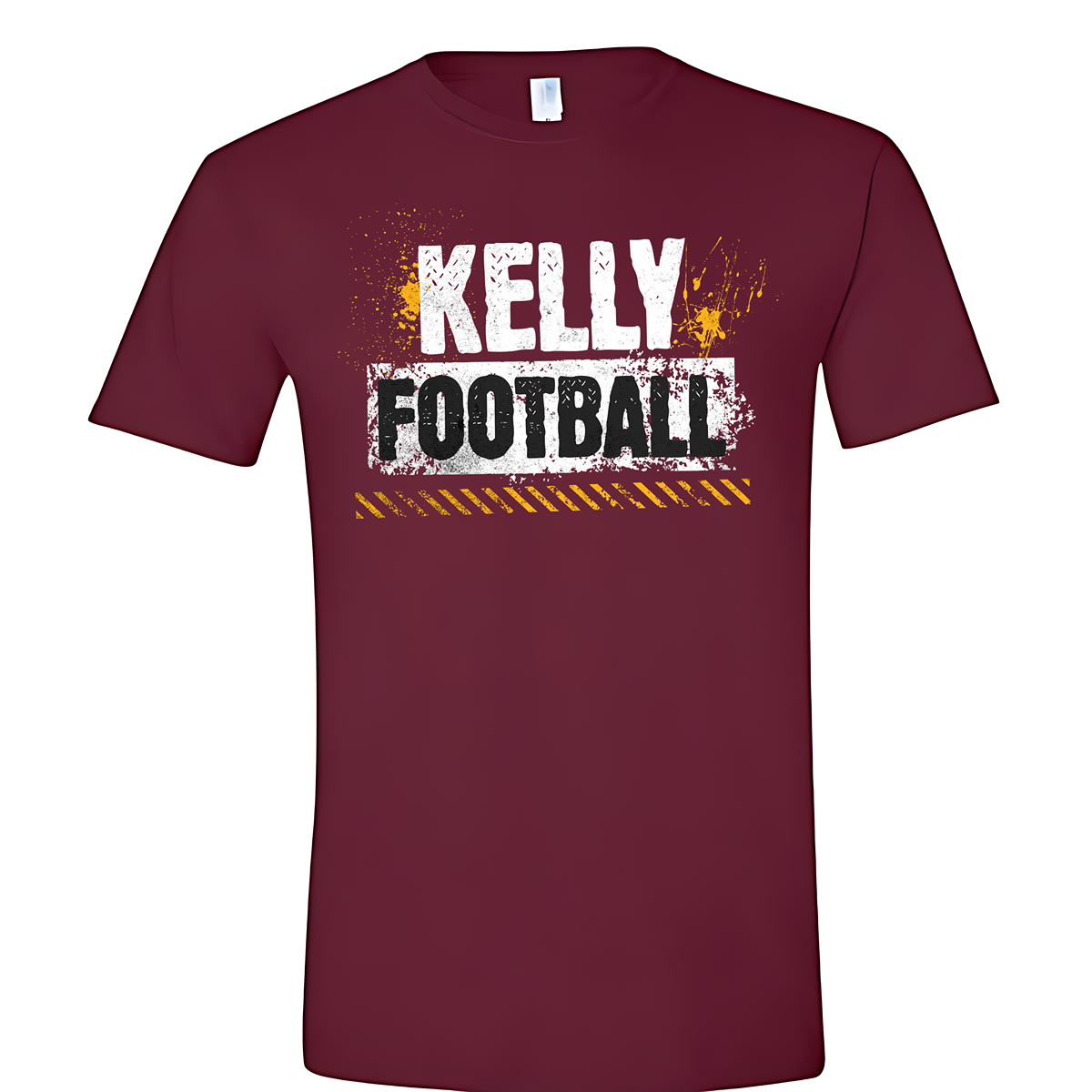 Make a statement with this eye-catching unisex tee featuring a bold, abstract Kelly Football design. The grunge-style black and white font gives it an edgy, streetwear vibe, while gold splatter details and a striking gold tire stripe across the bottom add texture and energy. Perfect for fans who like their spirit wear with a modern, artistic twist—this shirt is all about standing out while repping the Hawks.